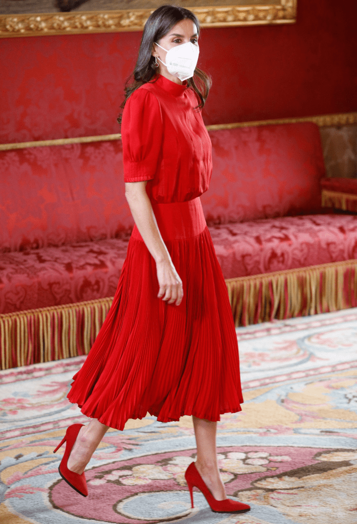 印有花樣的平口針織上衣,將肩頸的線條完整展露,亮眼的紫紅色一眼就抓住目光,下身選擇略為寬鬆的百褶牛仔裙,更突顯上身的線條。