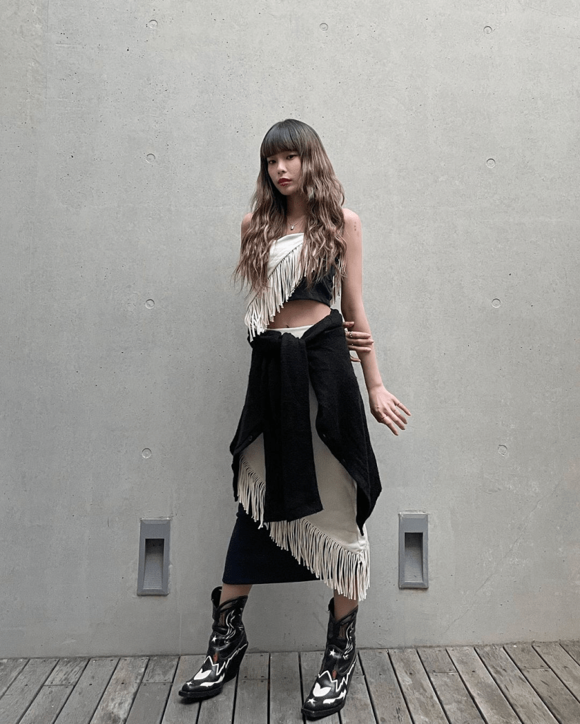 提到一字領穿搭許多人會先想到優雅、性感等等形容詞,不過一字領穿搭也能走出完全不同的風格。 Somi以寬鬆的Nike棉褲、長靴與老帽,玩出率性的街頭調性。